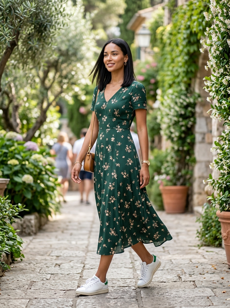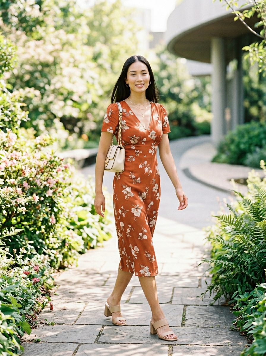 A refined take on everyday glamour, this floral midi dress is designed with a sleek, feminine silhouette that flatters effortlessly. The soft V-neckline and tailored fit create a clean, modern shape, while the delicate floral pattern adds a subtle touch of elegance.